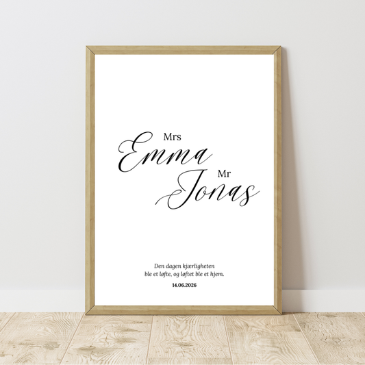 Personlig bryllupsplakat med navn – Mrs & Mr | Navneplakat 50×70 cm | Perfekt bryllupsgave