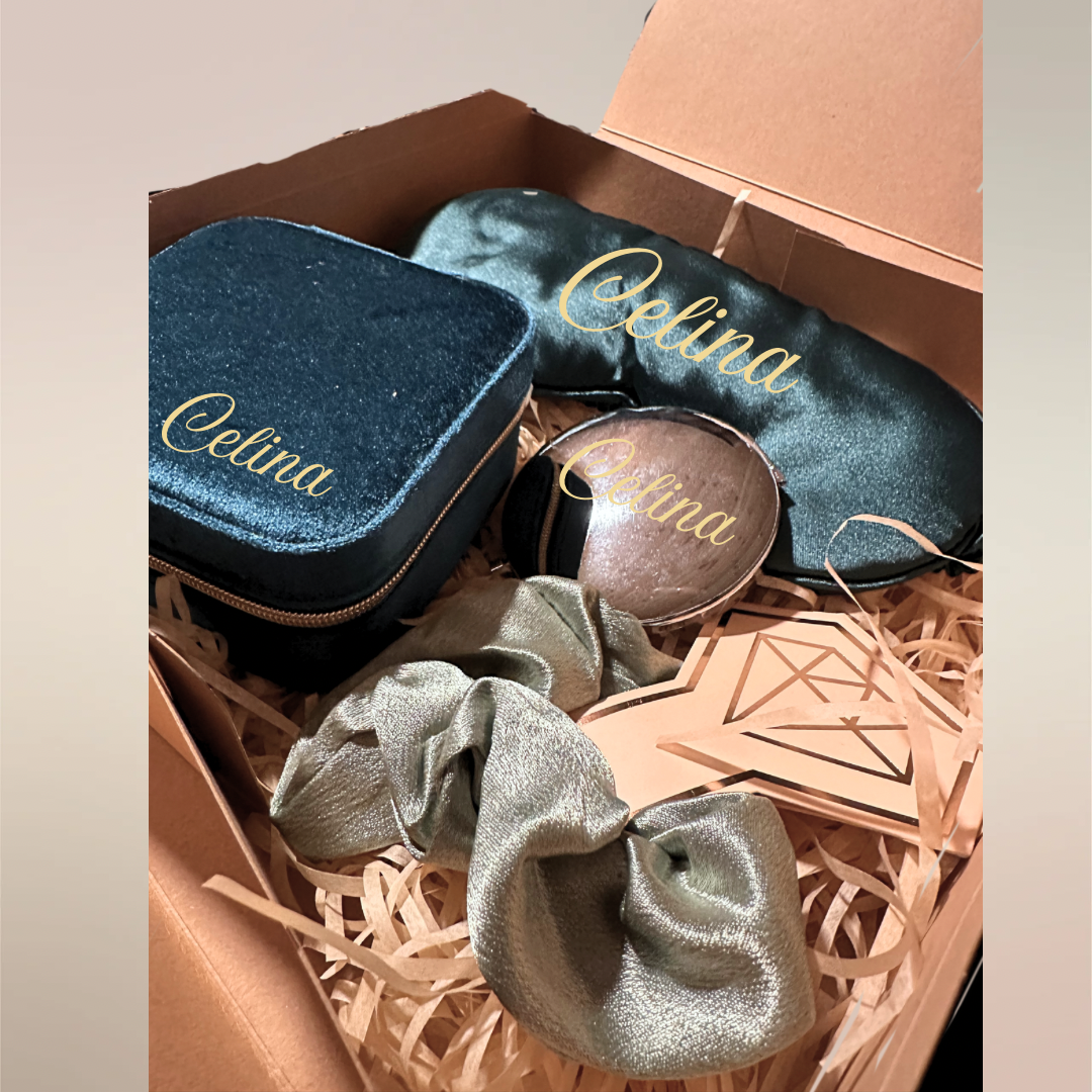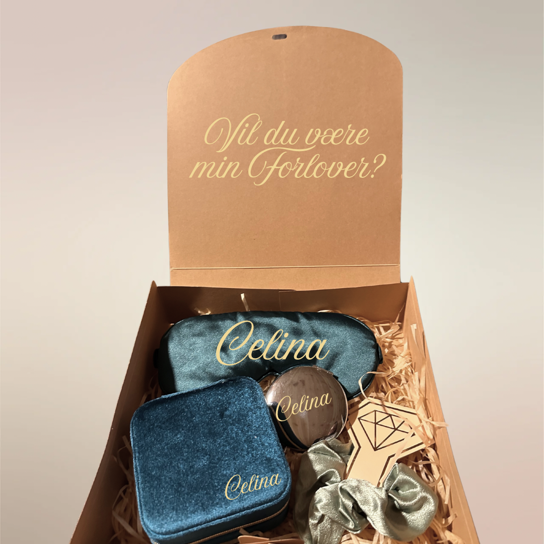 Den største gleden i livet er å si ja til sin kjære, og det må gjøres med din beste venninne ved din side. Overrask henne ved å gi denne gaveesken med spørsmålet om hun vil være din forlover. Det er en perfekt måte å vise din takknemlighet og sette pris på din venninne. Gaveesken inneholder et personlig lommespeil, et smykkeskrin, en sovemaske og scrunchies. Fyll inn din egen tekst og velge mellom ulike skrifttyper for å gi gaven en personlig touch.