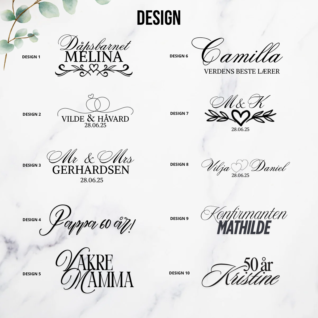 Velg mellom flere design på siste bilde, og tilpass med navn, dato eller en liten hilsen for et personlig preg.