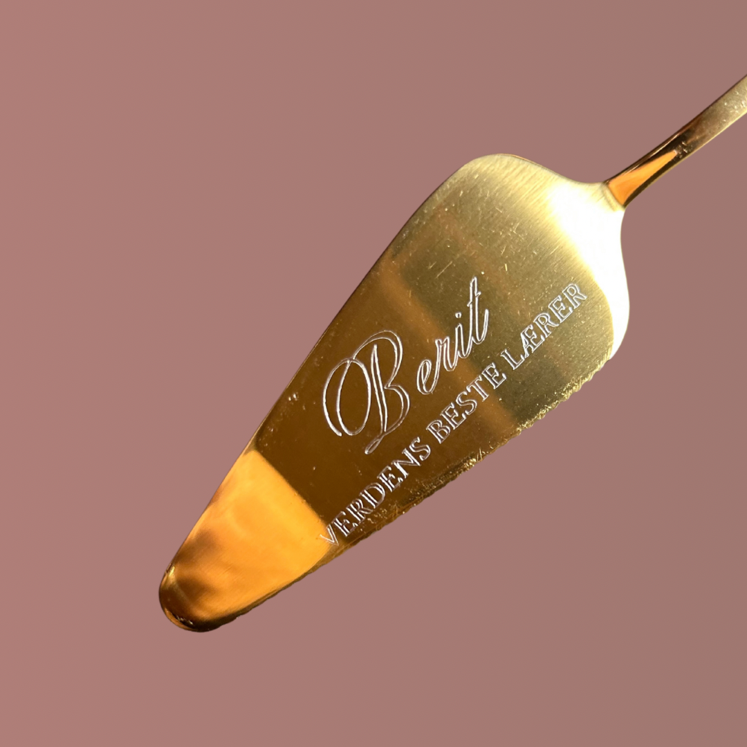 Gjør de store øyeblikkene ekstra spesielle med en vakker, personlig kakespade i gyllen rustfritt stål. Enten du skal skjære bryllupskaken, feire dåp, konfirmasjon eller et jubileum – denne kakespaden blir et varig minne fra dagen.