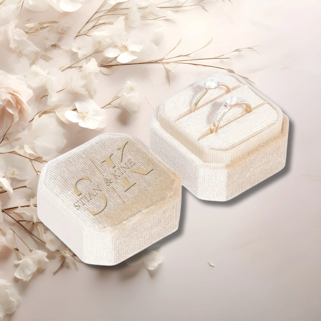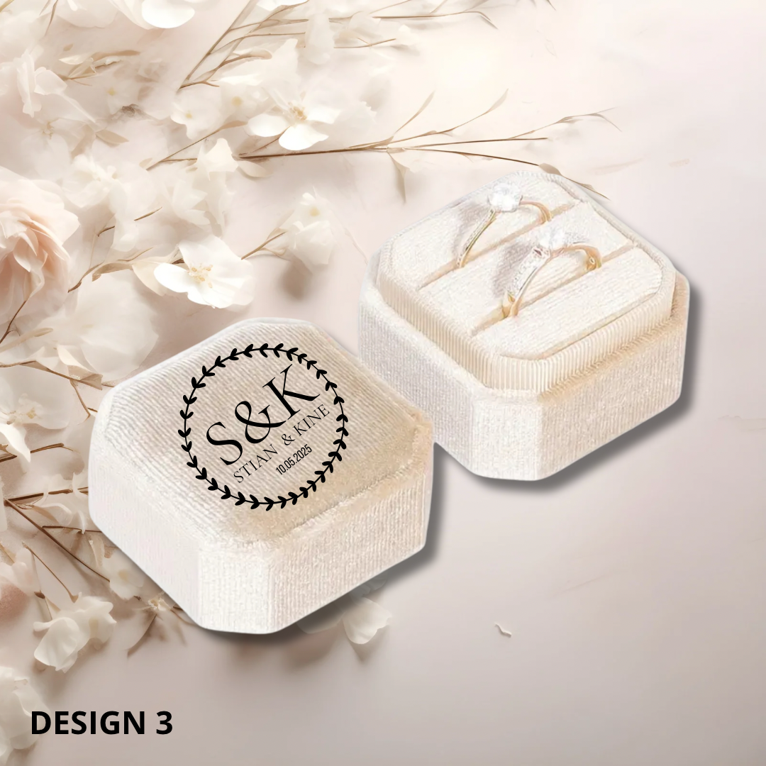 La kjærligheten skinne med en nydelig personlig gifteringboks, perfekt for å fullføre det magiske øyeblikket når ringene skal gis. Velg mellom fire romantiske design – alle med delikat gullskrift som gjør dagen enda mer uforglemmelig.